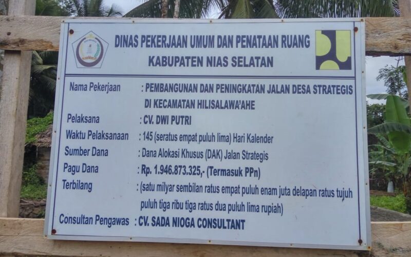 PIRNASCOM | NIAS SELATAN – Uang Negara sebesar Rp. 1,9 miliar lebih bersumber dari dana cadangan Alokasi Khusus TA 2020 untuk pembangunan jalan strategis desa di Kecamatan Hilisalawa’ahe Kabupaten Nias Selatan diduga di Mark Up dan dikerjakan asal jadi oleh Kontraktor CV. DWI PUTRI.