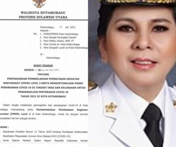 Edaran Walikota Kotamobagu Nomor 133/W-KK/VII/2021 tentang Perpanjangan PPKM Level 3 serta mengotimalkan posko penanganan Covid-19 di tingkat Desa dan Kelurahan untuk pengendalian penyebaran Covid-19 Tahun 2021, yang mulai diberlakukan sejak Tanggal 26 Juli hingga 02 Agustus 2021.