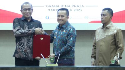 PIRNAS.COM | Palembang – Pemerintah Provinsi, Kabupaten dan Kota Se-Sumsel secara resmi menandatangani Naskah Perjanjian Hibah Daerah (NPHD) dana Pilkada serentak di Auditorium Bina Praja, Kamis (9/11/2023). Penandatanganan ini disaksikan langsung oleh Ketua Komisi Pemilihan