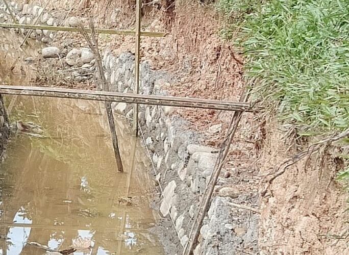 Jika dilihat dari beberapa sisi bahu pengerjaan draenase jalan atau yang biasa di sebut masyarakat saluran air badan jalan atau Parit jalan, banyak terlihat pengerjaan yang hampir rampung pemasangan batunya Longsor bertaburan, seperti pasangan pasir batu kurang adukan semen.