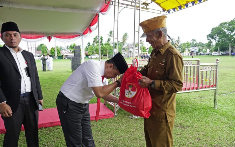 Usai pelaksanaan upacara, Bupati Zahir memberikan paket sembako secara simbolis kepada puluhan veteran.