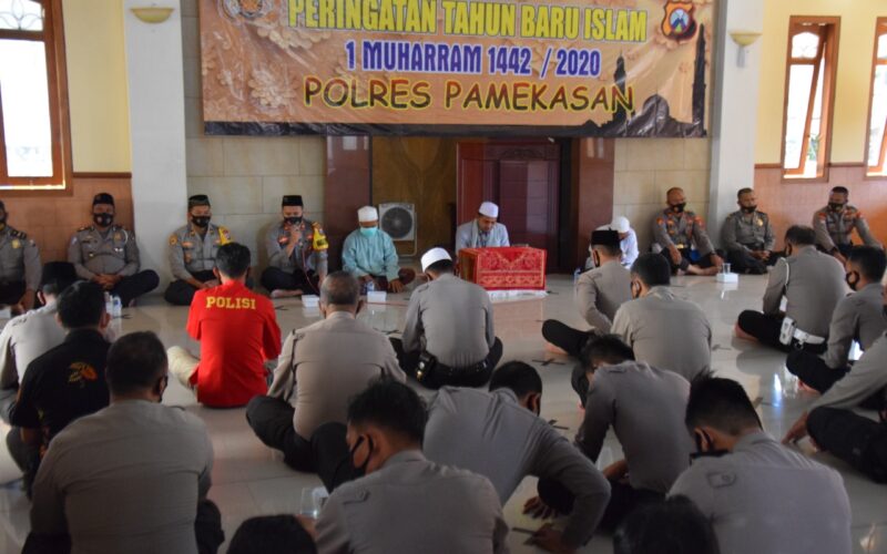 PIRNAS.COM | PAMEKASAN – Kepolisian Resort Pamekasan, Madura, Jawa Timur menggelar giat pengajian, tausyiah dan doa bersama dalam rangka memperingati Tahun Baru Islam, 1 Muharram 1442 Hijriah.