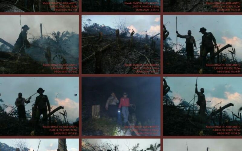 PIRNAS.COM | LABURA – Tim Kepolisian Polsek Kualuh Hulu bersama dengan Warga setempat melakukan pengechekan lokasi titik api yang terpantau berdasarkan Hotspot Satelit : SNPP/VIIRS di Desa Siamporik, Kec. Kualuh Selatan pada hari Sabtu (8/8/2020), kemarin.