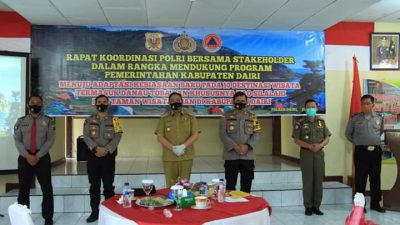 PIRNAS.COM | DAIRI – Polres Dairi gelar rapat koordinasi bersama stakeholder mendukung program pemerintah menuju adaptasi kebiasaan baru (AKB) pada sektor pariwisata, Selasa (21/7/2020) di aula Polres.