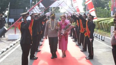 Apel penyambutan pejabat baru Kapolres Labuhanbatu AKBP Deni Kurniawan,SIK, MH didampingi istri Ny. Kiki Deni Kurniawan yang sebelumnya menjabat Kapolres Nias, dihiasai kalung bunga dan disambut tari tepak memeriahkan suasana.