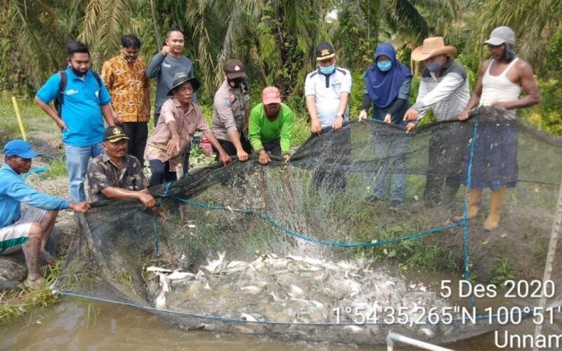 PIRNAS.COM | ROHIL – Bhabinkamtibmas Pedamaran Polsek Bangko Bersama Masyarakat Kepenghuluan Karya Mulyo Sari Kecamatan Pekaitan melaksanakan Pemanenan budidaya ikan patin dalam program ketahanan pangan, Sabtu 05 Desember 2020, Siang Semalam.