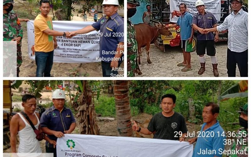Desa yang menerima bantuan Kurban Melalui Dana CSR PT Cakra Alam Sejati yaitu, Desa Lipaibulan Kecamatan Kerumutan, yang diserahkan langsung kepada Kepala desa Asril, Desa Terbangiang Kecamatan Bandara petalangan langsung diserahkan kepada kepala Desa Terbangiang Yohanis Spd, Desa Tambun Kecamata Bandara petalangan diserahkan langsung oleh Menager perkebunan kepada Kepala Desa Hendri T bersama Tokoh Masyarakat dan Desa Pesaguan Kecamatan Pkl Lesung diserahkan langsung Kepada yang mewakili Kepala desa Pesaguan Eri Sulaiman RT 01 RW 04 simpang sepakat Desa Pesaguan.