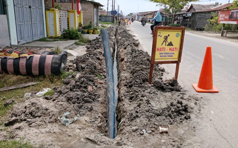 Pipa nampak jelas terpampang di ruas bahu jalan Lima Laras Bagan Dalam disisi kiri. Kondisi pipa masih baru berwarna hitam bergaris biru, lanjut Amin selaku ketua (Gam) BB.
