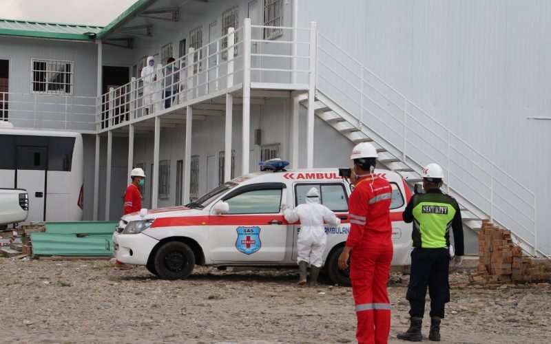 “Kami sudah menyaksikan protokol kesehatan yang sudah didemonstrasikan, bagaimana disimulasikan protokol kesehatan yang diterapkan pemerintah. Apabila ada karyawan atau pimpinan, baik itu kontraktor atau dari grup lain yang datang dan ternyata menurut indikasi medis harus mendapatkan perawatan, sudah tersedia ambulance dan langsung ditangani petugas PT. DPM dengan menggunakan full APD dan sudah memenuhi standar internasional dan langsung dibawa ke RSUD untuk ditangani setelah sebelumnya berkoordinasi dengan pihak RSUD. Jadi proses dan simulasi ini sudah dilatih dan dipersiapkan sebelumnya,” ungkap Bupati.