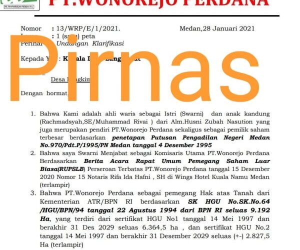 Undangan itu sesuai dengan surat Nomor:13/WRP/E/1/2021. Dan Surat Nomor: 12/WRP/E/1/2021. Perihal Undangan dan Klarifikasi. Demikian di sebutkan Swarni selaku Komisaris Utama PT Wonorejo Perdana pada Media pada hari senin (1/2/2021).