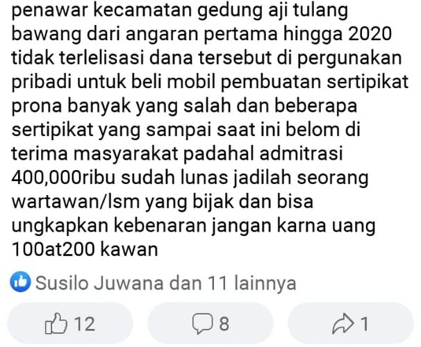 Di akun Facebook Munsir tertulis dengan jelas, “Di Kampung Penawar dan Gedung Aji ini sudah hampir setiap rumah jadi Wartawan dan LSM. Tapi semua pada kaleng kaleng bermuka uang 100+200. Jelas dana bumkam. Kampung Penawar, Kecamatan Gedung Aji, Tulang Bawang dari angaran pertama hingga 2020 tidak terealisasi. Dana tersebut digunakan pribadi untuk beli mobil. Pembuatan sertifikat prona banyak yang salah. Dan sampai saat ini beberapa sertifikat yang belum di terima masyarakat, padahal adminitrasi 400 ribu kita sudah bayar lunas. Jadilah wartawan dan LSM yang bijak dan bisa ungkap kebenaran, jangan karena uang 100 atau 200 kawan,”.