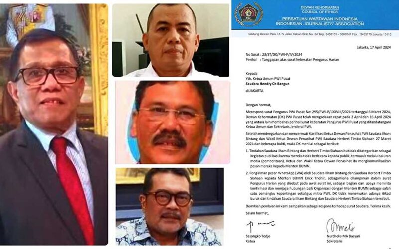 Pirnas.com | Jakarta – Setelah heboh di publik terkait Surat PWI Pusat yang meminta agar Ketua dan Wakil Ketua Dewan Penasehatnya, Ilham Bintang dan Timbo Siahaan, diberikan peringatan keras, Dewan Kehormatan PWI akhirnya buka suara. Dalam surat tertanggal 17 April 2024 yang dikirimkan kepada pengurus pusat Persatuan Wartawan Indonesia (PWI), Dewan Kehormatan menyatakan bahwa apa yang dilakukan oleh Dewan Penasehat PWI itu bukan sebuah pelanggaran.