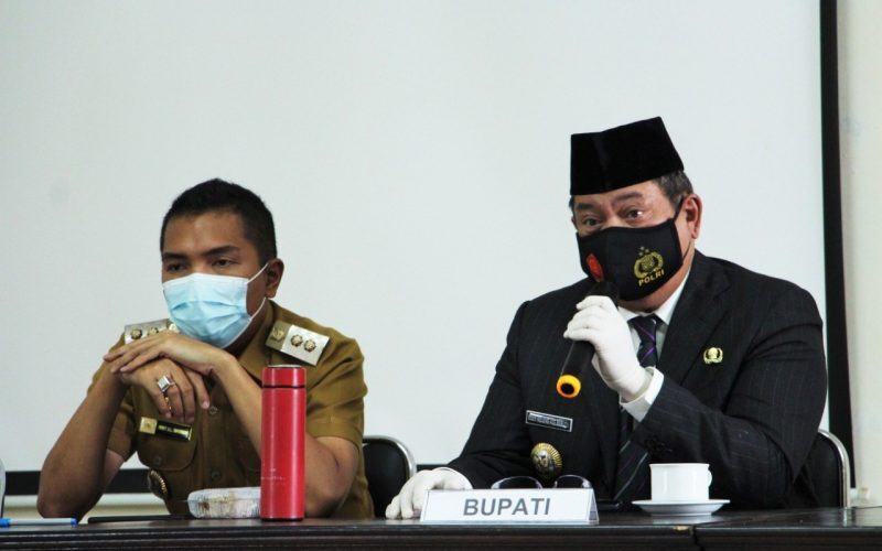 PIRNAS.COM | SIDIKALANG – Bupati Dairi Dr. Eddy Keleng Ate Berutu mengadakan rapat bersama dengan Satuan Tugas (Satgas) Penanganan Covid-19 Kabupaten Dairi pada Senin (5/10/2020) di ruang rapat Sekretariat Daerah Kabupaten Dairi. Rapat tersebut membahas tentang bagaimana tindakan dan upaya penanganan covid-19 di Kabupaten Dairi dikarenakan jumlah kasus positif covid-19 di Kabupaten Dairi sesuai data per tanggal 4 Oktober 2020 naik signifikan yakni sebanyak 24 orang. Turut hadir dalam rapat tersebut Wakil Bupati Dairi Jimmy Andrea Lukita Sihombing, SH, Dandim 0206 Dairi Letkol. Arm. Adietya Yuni Nurtono, SH, Kapolres Dairi AKBP. Ferio Sano Ginting, S.I.K serta Sekretaris Daerah Kabupaten Dairi Drs. Leonardus Sihotang.