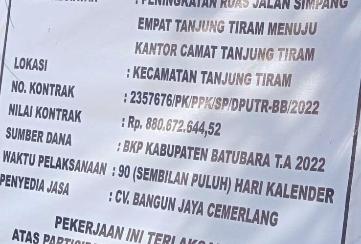 Lanjut informasi di himpun dari laman portal lpse kab batu bara degan judul kegiatan.”Peningkatan Ruas jalan simpang empat tg tiram menuju kantor camat tg tiram.”Plaksanakan oleh : CV Bangun Jaya Cemerlang. Pagu anggaran: Rp. 880.672.644.52 Sumber dana:BKP Kab. Batu Bara T.A 2022. No kontrak: 2357676/PK/PPK/SP/DPUTR-BB/2022 Waktu pelaksanaan : 90 hari kerja Dinas Pekerjaan umum dan Penataan Ruang Kab. Batu Bara TA 2022.