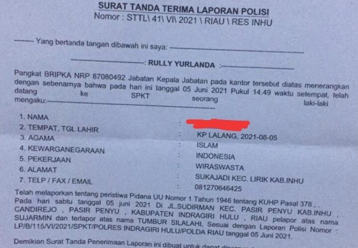PIRNAS.COM | RIAU – Sujarmin yang sebelumnya telah di laporkan oleh BER, di Mapolres Labuhanbatu, provinsi Sumatera Utara, kini membuat Laporan kembali terkait dugaan penipuan yang di lakukan oleh T. Silalahi, sesuai dengan surat tanda terima laporan polisi nomor : STTL/41/VI/2021/RIAU/RES INHU tertanggal 05 Juni 2021, sekitar 14.49 wib. Di Jl. Ahmad Yani no.19 Rengat, Indragiri Hulu, Riau.