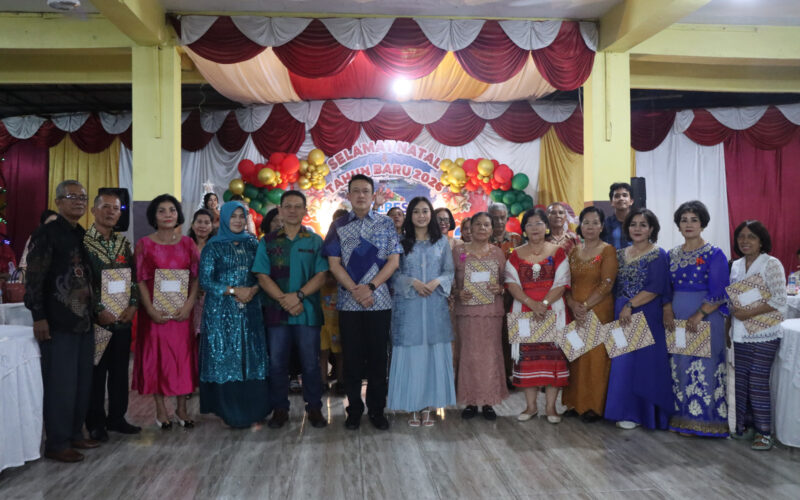 Mengakhiri kegiatan perayaan Natal tahun 2025, Kapolres Binjai Akbp Bambang C. Utomo, memberikan bingkisan Natal kepada para purnawiran/warakawurin, pensiunan ASN polres Binjai dan anak yatim piatu.
