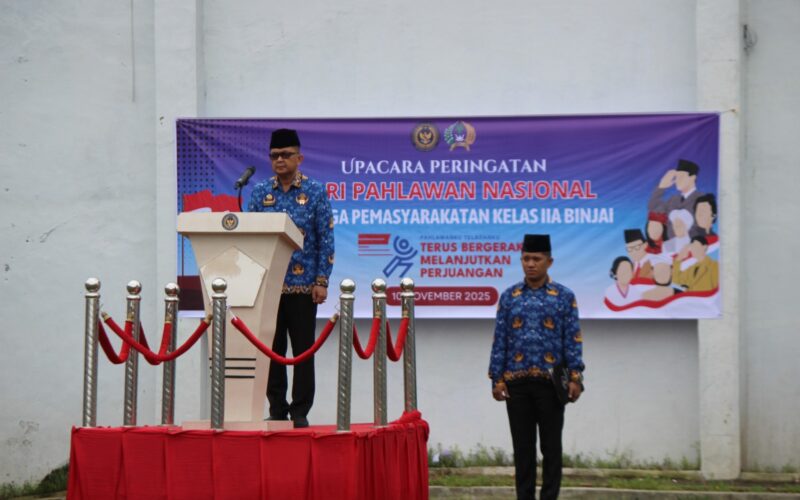 Kepala Lapas Binjai, Wawan Irawan , bertindak sebagai Inspektur Upacara. Dalam kesempatan tersebut, Kalapas membacakan Amanat Menteri Sosial Republik Indonesia, Saifullah Yusuf, dalam rangka memperingati Hari Pahlawan Nasional Tahun 2025 yang mengusung tema “PAHLAWANKU TELADANKU, TERUS BERGERAK, MELANJUTKAN PERJUANGAN.”