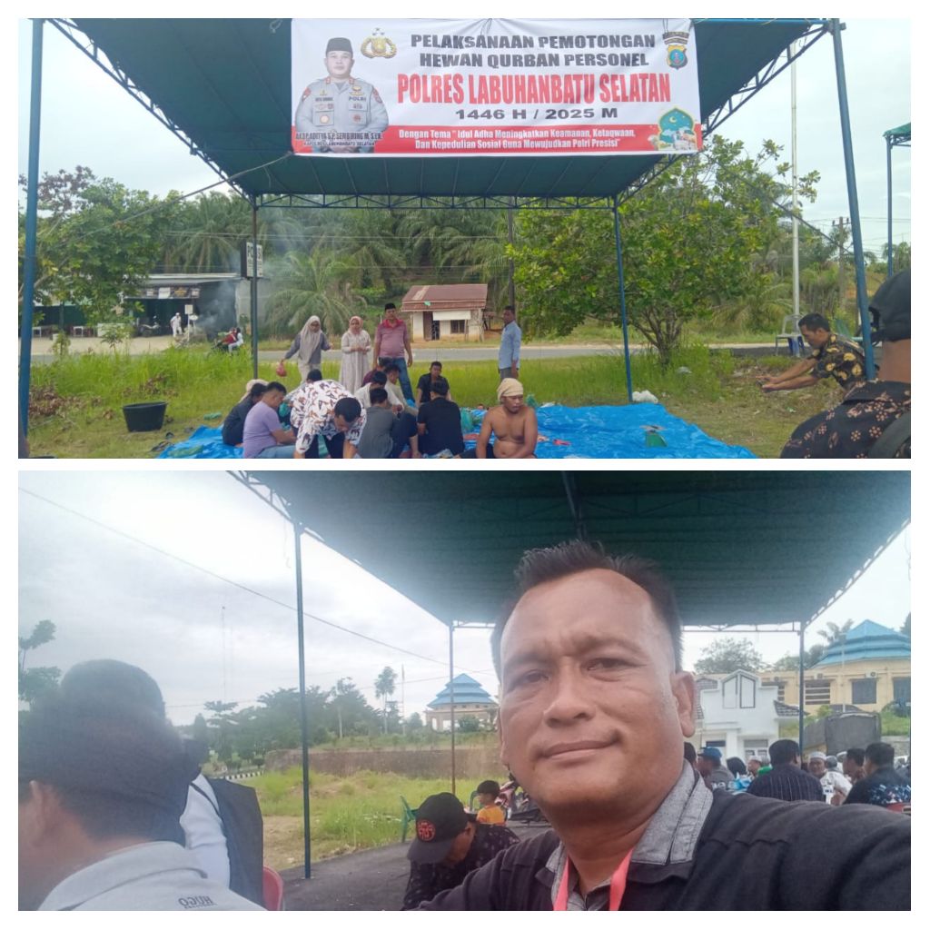 LABUSEL || PIRNAS.COM – Dalam rangka merayakan hari raya idul adha 1446 H. THN 2025 M Polres labuhanbatu selatan sembelih 11 ekor sapi dan 1 ekor kambing yang di laksanakan di komplek halaman perkantoran polres labusel kecamatan kota pinang kabupaten labuhanbatu selatan provinsi sumatera utara, jumat [ 6/6/2025 ]