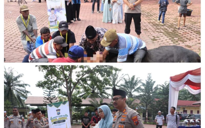 LANGKAT || PIRNAS.COM – Dalam semangat berbagi di Hari Raya Idul Adha 1446 Hijriah/2025 Masehi, Kapolres Langkat, AKBP David Triyo Prasojo, SH, SIK, MSi., menyerahkan 12 ekor sapi dan 5 ekor Kambing kurban kepada panitia pemotongan hewan kurban Polres Langkat, Penyerahan dilakukan di halaman Mapolres Langkat dan langsung dilakukan pemotongan hewan Kurban oleh Panitia, Jumat 6 Juni 2025 pagi.
