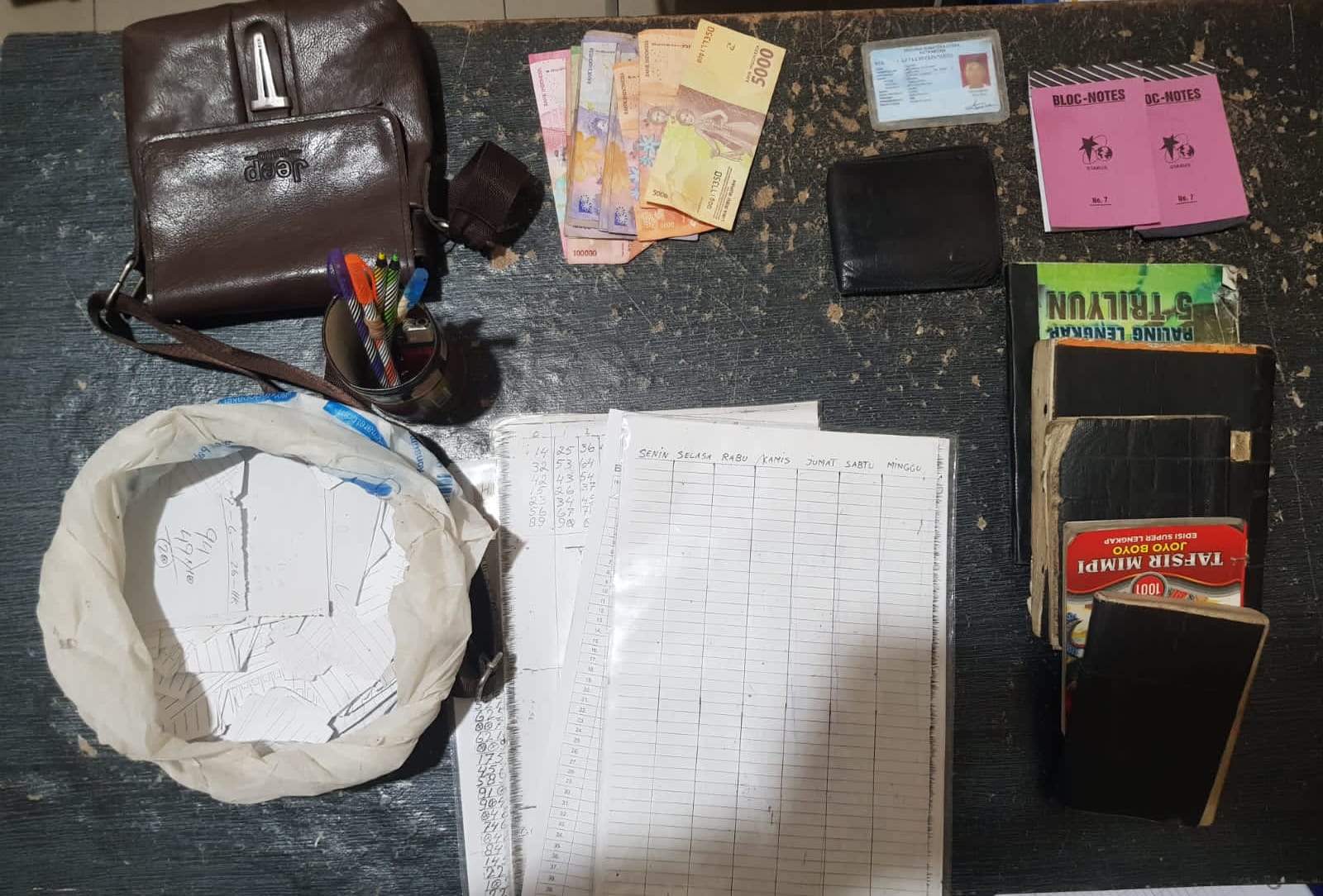 Tersangka yang diamankan diketahui bernama Tugiono (55), warga setempat. Dalam penangkapan tersebut, petugas mengamankan sejumlah barang bukti berupa uang tunai Rp 315.000,-, satu buah tas, satu buah dompet berisi uang Rp 10.000,-, lima buah pulpen, dua buah buku catatan, empat lembar rekapan nomor togel, serta satu plastik kresek berisi potongan kertas pemasangan nomor togel dari para pembeli.