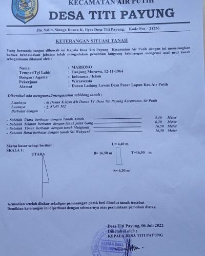 PIRNAS.COM | BATU BARA – Adapun posisi tanah tersebut terletak di Dusun K.Ilyas d/h Dusun VI, Desa Titi Payung, Kecamatan Air Putih, Kabupaten Batu Bara. Untuk Sebelah Utara berbatasan dengan tanah Asnah = 4,40 m, sebelah Timur berbatasan dengan