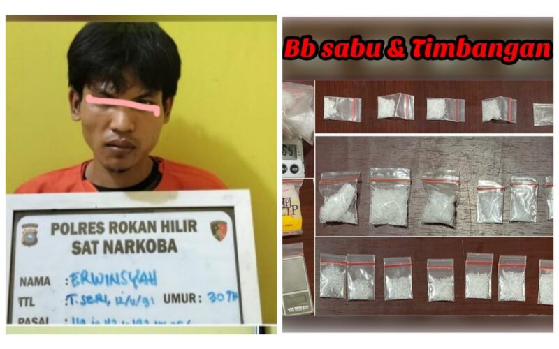 Berdasarkan Data Dirangkum Kapolres Rokan Hilir AKBP Nurhadi Ismanto Ismanto SH SIK melalui Kasubbag Humas Polres Rohil AKP Juliandi SH saat di konfirmasi menjelaskan barang bukti (BB) yang di dapatkan dari penggeledahan rumah tersangka, yaitu 1 Bungkus plastik berisi butiran krsital diduga narkotika jenis sabu yang ditemukan dikantong celana ERWIN.