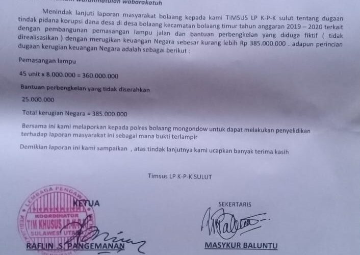 Kasus yang melanda di Desa Bolaang Kecamatan Bolaang Bolmong akhirnya mendapat pengawalan dari pihak LP.K-P-K. Sulawesi Utara, Raflin S. Pangemanan bersama Sekretarisnya Maskur Baluntu yang akan mengadakan pendampingan besok di Polres Bolmong di bagian Tindak Pidana Korupsi (Tipikor) seperti yang tertua pada laporan Masyarakat Desa Bolaang.