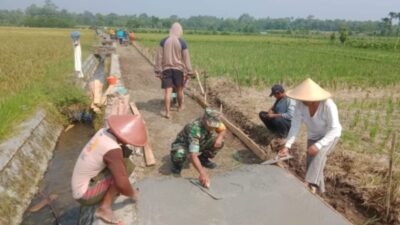 Seperti terlihat saat ini, Serda Alim Santoso bersama warga masyarakat saling bergotong royong, bekerja sama untuk melaksanakan kegiatan pengecoran jalan menuju ke persawahan, bertempat di Dusun Wonorejo RT. 02 RW. 07 Desa Jambewangi Kec. Selopuro Kab. Blitar, Jumat (30/6/2023).