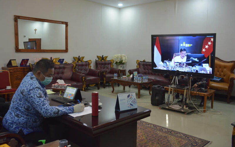 PIRNAS.COM | DAIRI – Bupati Dairi Dr. Eddy Keleng Ate Berutu mengikuti rapat koordinasi peningkatan angka kesembuhan (recovery rate) dan penurunan angka kematian (mortality rate) melalui manajemen perawatan pasien covid-19 yang optimal pada Kamis (17/8/2020) yang dilaksanakan melalui video conference (vidcon) di ruang kerja Bupati Dairi. Rapat koordinasi tersebut di pimpin langsung oleh Menteri Koordinator Bidang Kemaritiman dan Investasi (Menko Marves) Luhut Binsar Pandjaitan yang diikuti oleh Gubernur Sumatera Utara Edy Rahmayadi, Gubernur DKI Jakarta Anies Baswedan, Gubernur Jawa Barat Ridwan Kamil, Gubernur Jawa Tengah Ganjar Pranowo, Gubernur Jawa Timur Khofifah Indar Parawansa dan para petinggi TNI dan Polri dari 8 Provinsi.