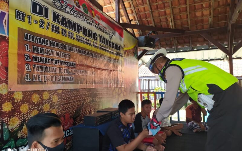 Kanit Dikyasa Satlantas Polres Pamekasan bersama beberapa anggotanya melakukan sosialisasi Maklumat Kapolri tentang pencegahan covid-19 dan program Kampung Tangguh kepada pemuda karang taruna Kelurahan Kangenan Kecamatan Pamekasan Kabupaten Pamekasan.