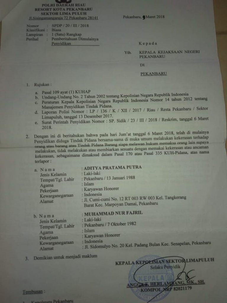 Sedang, Kepala Kepolisian Sektor Lima Puluh AKP Sanny Handityo SH SIK ketika dikonfirmasi media ini melalui Kanit Reskrim Iptu Zulfikri Yanto SH, Selasa (10/03/2020) mengatakan, bahwa perkara ini sudah dikirim ke Kejaksaan Negeri Pekanbaru, kemudian dikembalikan lagi oleh Jaksa Penuntut Umum, dan setelah kami lengkapi petunjuknya, kami kirim lagi ke Kejaksaan Negeri Pekanbaru, kemudian pihak Kejaksaan kembalikan lagi (P-18 dengan P-19 Nomor: B-217/L.4.10/Eku.1/08/2019, menerapkan bahwa unsur-unsur Pasal 170 ayat (1) KUHP atau Pasal 335 ayat (1) KUHP yang dipersangkakan kepda tersangka tidak terpenuhi.