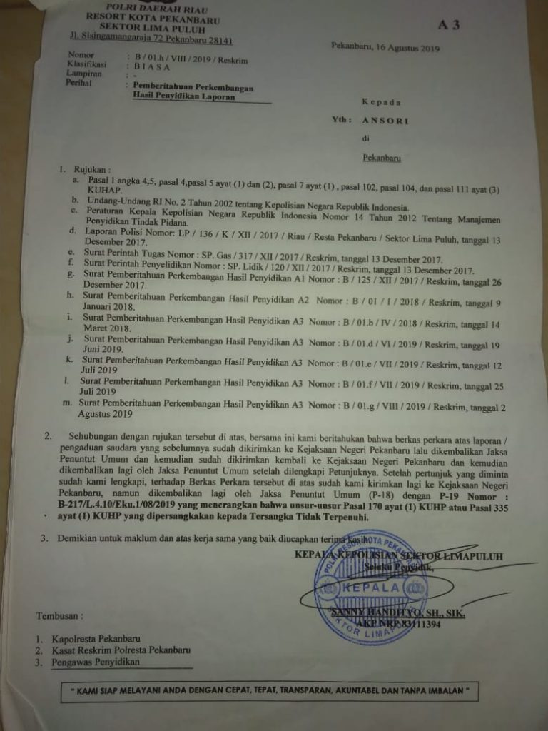 Dikatakan Ansori bahwa pihak penyidik Polsek dalam memberikan laporan perkembangan penyidikan laporan pengaduannya memberitahukan bahwa Laporan/pengaduannya telah di lakukan penyelidikan dan berkas perkara sudah diserahkan ke Kejaksaan Negeri Pekanbaru, namun berkas perkara dikembalikan untuk dilengkapi sesuai petunjuk jaksa penuntut umum (JPU) dan selanjutnya akan memenuhi petunjuk dari jaksa penuntut umum.pada tanggal ,19 Juni 2019.