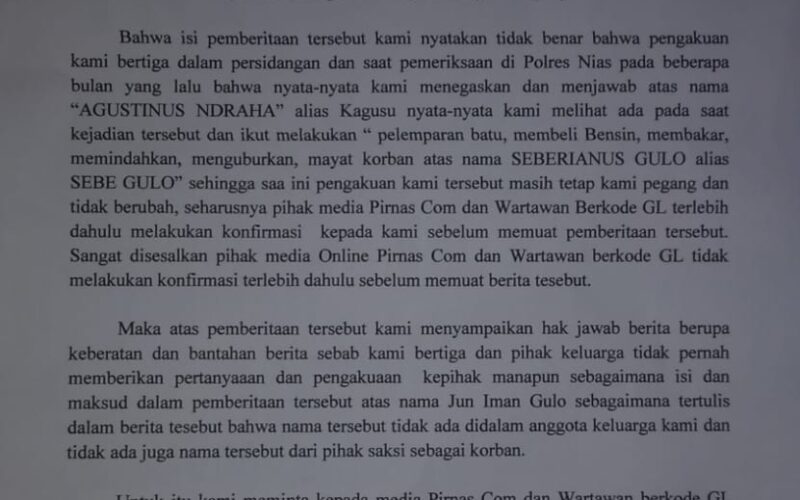 Atas pemberitaan sebelumnya yang berjudul “Faigiasa Bawamenewi SH Membantah Dirinya Dikatakan Pembela Pembunuh” Linus Gulo CS, mengatakan tidak pernah memberikan pernyataan dan pengakuan ke pihak manapun sebelumnya sebagaimana isi dalam berita tersebut di atas.