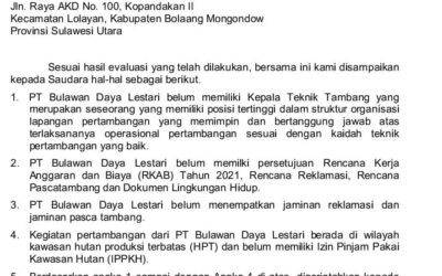 PIRNAS.COM | BOLMONG – Aktifitas dari BDL mendapat surat dari Kementrian Energi dan Sumber Daya Mineral (ESDM) melalui Direktorat Mineral dan Batu Bara (Ditjen Minerba) perintahkan aktivitas kegiatan pertambangan dihentinkan. Surat yang dilayangkan tersebut dengan Nomor : B-4314/MB.07/DBT/2021 perihal Penghentian Kegiatan Pertambangan yang ditujukan Kepada Direktur Utama PT. Bulawan Daya Lestari (PT. BDL) dengan Alamat …