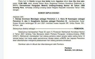 PIRNAS.COM – Permohonan pengujian materi Pasal 15 ayat (2) huruf f dan ayat (5) Undang-Undang Nomor 40 Tahun 1999 Tentang Pers terhadap Undang-Undang Dasar Negara Republik Indonesia Tahun 1945, dalam waktu dekat akan segera disidangkan di Mahkamah Konstitusi menyusul. Akta registrasi perkara konstitusi Nomor : 38/PUU/PAN.MK/ARPK/08/2021 telah dicatat dalam Buku Registrasi Perkara Konstitusi Elektronik (e-BRPK) …