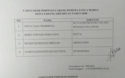 PIRNAS.COM | SUMUT – Pimpinan Daerah Pemuda Panca Marga (PD PPM) Provinsi Sumatera Utara bentuk dan menghunjuk kepengurusan Caretaker Pimpinan Cabang Pemuda Panca Marga (PC PPM) Kota Padang Sidempuan tahun 2020, tertanggal 14 Desember 2020. Ketua PD PPM Sumut Tirtayasa Sembiring melalui Sekretaris PD PPM Sumut Indra Mada Ritonga mengatakan, Terkait kebutuhan organisasi hal ini …