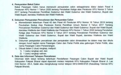 PIRNAS.COM | PAKPAK BHARAT – KPU Kabupaten Pakpak Bharat telah mengumumkan waktu dan tanggal serta tempat pendaftaran pasangan Calon Bupati (Cabup) dan Calon Wakil Bupati (Cawabup ) Kabupaten Pakpak Bharat tahun 2020. Surat pengumuman pendaftaran pasangan Calon Bupati dan Calon Wakil Bupati Kabupaten Pakpak Bharat dari Ketua KPU Pakpak Bharat, Basra Munthe melalui Sekretaris KPU …