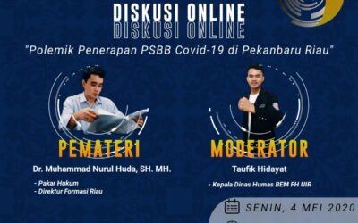 PEKANBARU | PIRNAS.COM – Universitas Islam Riau (UIR) melalui Badan Eksekutif Mahasiswa Fakultas Hukum (UIR) menyelenggarakan Diskusi Online yang bertema : Polemik Penerapan PSBB Covid-19 Di Pekanbaru, acara tersebut di ikut sertakan dari Para Pakar Hukum, Aktivis dan Mahasiswa UIR. Turut hadir pula di acara tersebut Ahli/pakar Hukum Pidana, Dosen Hukum Pidana Universitas UIR Dr.Muhammad Nurul …