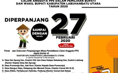 PIRNAS.COM & PIRNAS.ORG | LABURA- Komisi Pemilihan Umum Kabupaten Labuhanbatu Utara (Labura), memperpanjang masa pendaftaran calon anggota PPS dalam Pemilihan Bupati dan Wakil Bupati Kabupaten Labuhanbatu Utara pada tahun 2020. Hal ini hanya berlaku bagi Desa/Kelurahan yang tidak memenuhi 2 kali kebutuhan pendaftar. Demikian disampaikan Oleh Heriamsyah Simanjuntak SH.I Ketua KPU Kab. Labura, melalui Pesan …