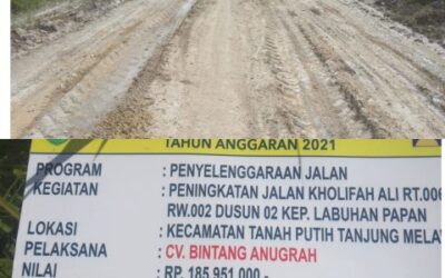 PIRNAS.COM | ROHIL – Kegiatan proyek Aucas di jalan Kholifah Ali RT 006 RW 002 dusun 02 Kepenghuluan (Desa) Labuhan Papan, Kecamatan Tanah Putih Tanjung Melawan, Kabupaten Rokan Hilir – Riau diduga dikerjakan secara asal-asalan. Proyek yang bersumber dari Dana APBD P tahun 2021 senilai Rp.185.951000 dikerjakan CV. Bintang Anugrah sepanjang 300 M. Menurut keterangan …