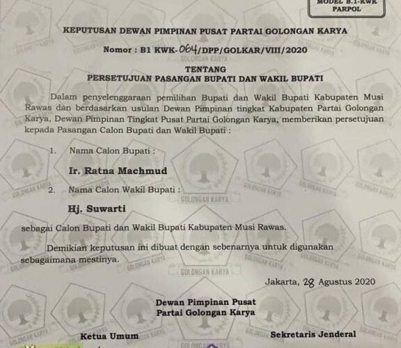 Surat keputusan DPP Golkar dengan nomor B1-KWK-064/DPP/GOLKAR/VIII/2020 tentang persetujuan pasang bupati dan wakil bupati tertanggal 28 Agustus 2020 yang ditandatangani Ketum Airlangga Hartanto dan Sekjen Lodewijk F. Paulus.