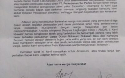 PIRNAS.COM | LABURA – Puluhan masyarakat dari tiga dusun Desa Suka Rame Peringgan Perusahaan Perkebunan PT. Sri Perlak di Desa Sukarame melayangkan surat kepada Bupati Labuhanbatu Utara atas kekhawatiran mereka terhadap dampak galian parit besar yang dibuat oleh PT. Sri Perlak. Demikian disebutkan Sindar 40 Warga Sukarame Kecamatan Kualuh Hulu pada Media Ini pada hari Senin …
