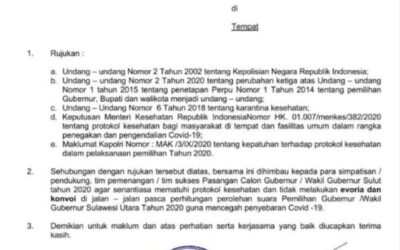 PIRNAS.COM | KOTAMOBAGU – Jajaran Kepolisian Resor (Polres) Kota Kotamobagu mengeluarkan imbauan untuk tidak melakukan konfoi usai penghitungan perolehan suara pada Pemilihan Kepala Daerah (Pilkada) serentak, Rabu (09/12). Hal ini termuat dalam surat himbauan nomor: B/825/XII/HUM.3.3./2020, yang ditandatangani Kapolres AKBP Prasetya Sejati SIK, dengan tembusan Kapolda Sulut, Waka Polda Sulut, Irwasda Polda Sulut, Karo OPS …