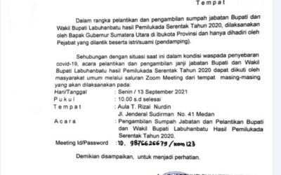 PIRNAS.COM | LABUHANBATU – Jadwal pelantikan Bupati dan Wakil Bupati Labuhanbatu Bapak Dr.H. Erik Adtrada Ritonga dengan Ibu Hj. Ellya Rosa Siregar Menjadi Bupati Dan Wakil Bupati Labuhan batu, berdasarkan keputusan Gubernur Sumatera Utara nomor 005 /8844, yang di keluarkan tanggal 10 September 2021 melalui PJ sekretaris Daerah provsu akan di laksanakan pada hari senin …